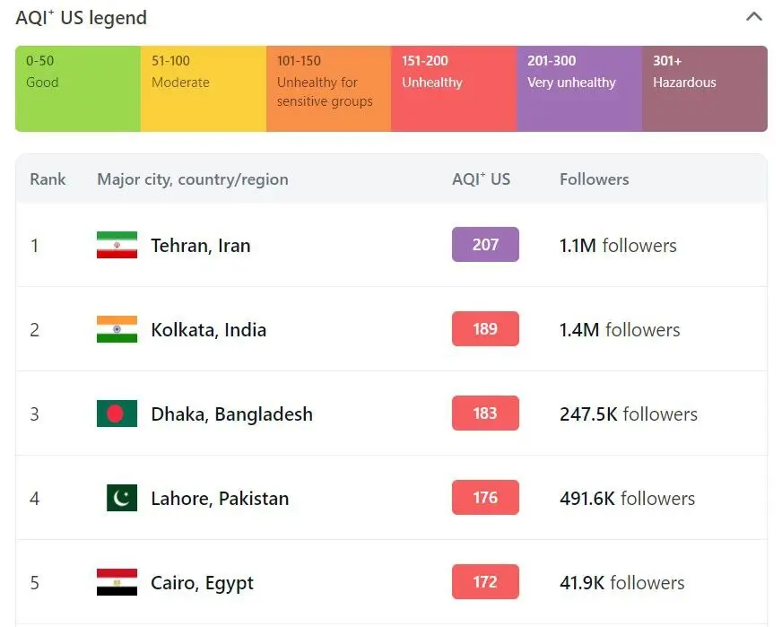 براساس اطلاعات شرکت سوئیسی IQAir، تهران درحالحاضر آلودهترین شهر جهان محسوب میشود.