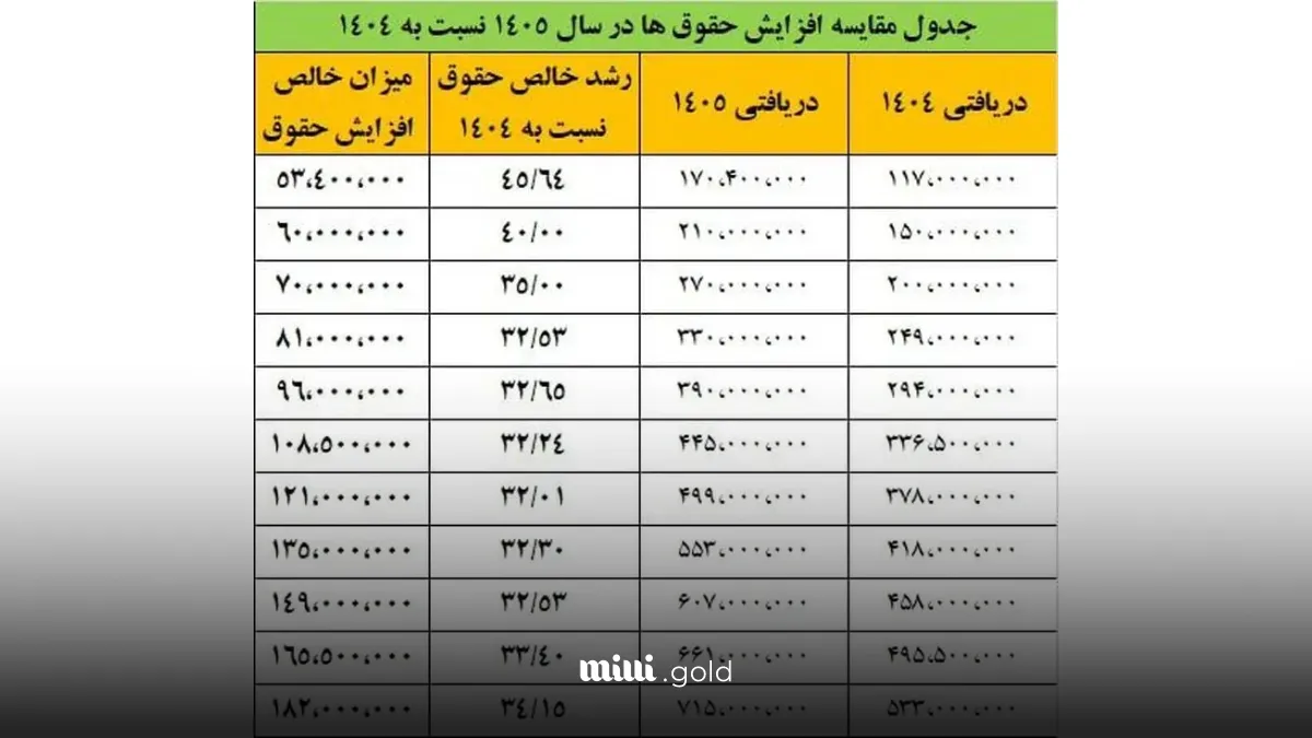 بر اساس تازهترین مصوبه مجلس، میزان افزایش حقوق کارمندان برای سال ۱۴۰۵ مشخص شد. مقایسه دریافتیها نشان میدهد که حداقل حقوق کارمندان نسبت به سال ۱۴۰۴ دستکم ۳۲ درصد افزایش یافته و در بالاترین سطوح تا ۴۵ درصد رشد خواهد داشت.
