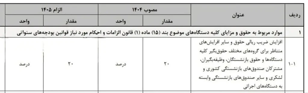 در بودجه ۱۴۰۵ میزان افزایش حقوق کارمندان و بازنشستگان ۲۰ درصد اعلام شد.