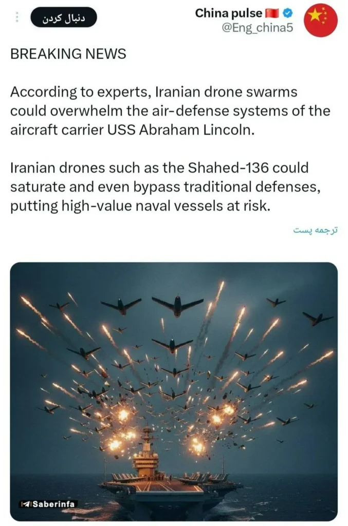 صفحه چینی China pulse نوشت: براساس نظر کارشناسان، گروههای پهپادی ایرانی میتوانند سیستمهای دفاع هوایی ناو هواپیمابر یواساس آبراهام لینکلن را تحت فشار قرار دهند.