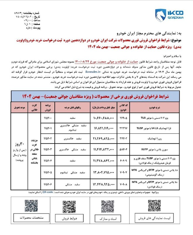 شرکت ایران خودرو بخشنامه فروش فوری ، فروش فوق العاده محصولات خود را ویژه منتخبین دوازدهمین دوره ثبت نام (طرح جوانی جمعیت) اعلام کرد.