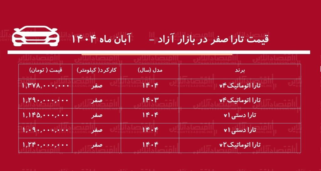 قیمت تارا شنبه ۲۴ آبان/ افزایش قیمت مدلهای اتوماتیک و دندهای در بازار امروز